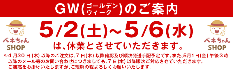 ベネちゃんSHOPでは、ゴールデンウィークの期間、下記の通り休業とさせていただきます。